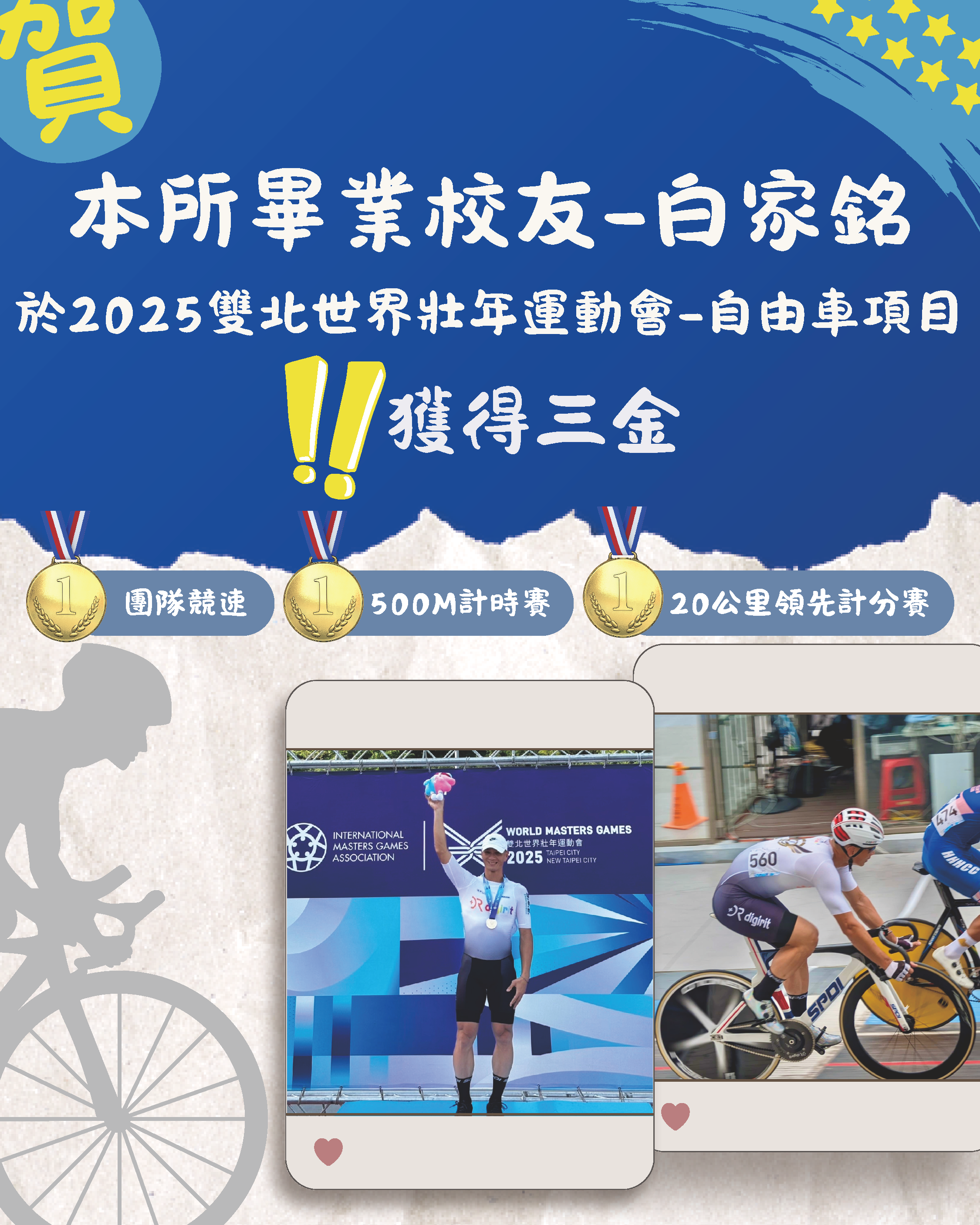 賀!碩士班校友白家銘參加2025雙北世界壯年運動會獲自由車項目3金!