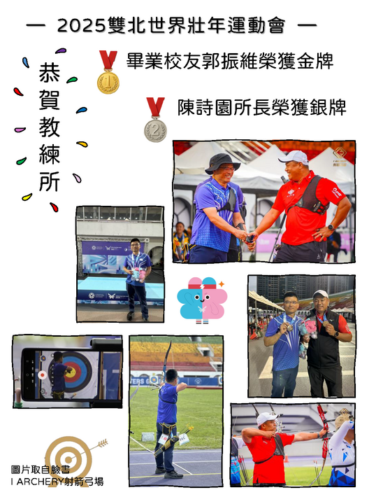 賀!本所畢業校友郭振維及陳詩園所長參加2025雙北世界壯年運動會射箭項目分別奪下金牌及銀牌!